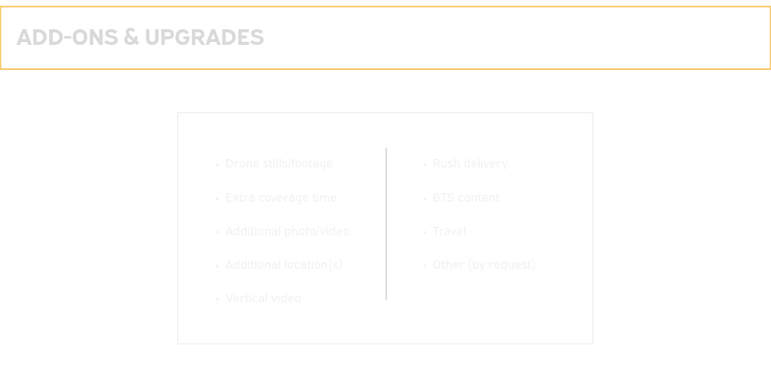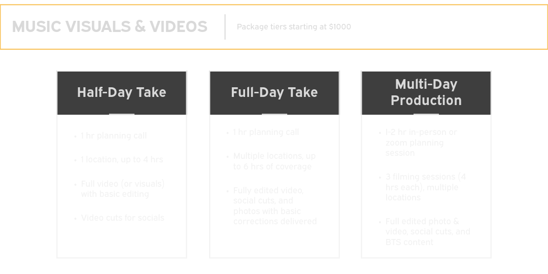 The goal of your project is our top priority. We want to understand your vision, objectives, and budget so we can create a customized plan that fits your needs. Every project is unique, with different gear, skills, time commitments, and desired outcomes. Regardless of your project size or budget, we will collaborate closely with you to bring your vision to life while keeping costs and expectations clear.
